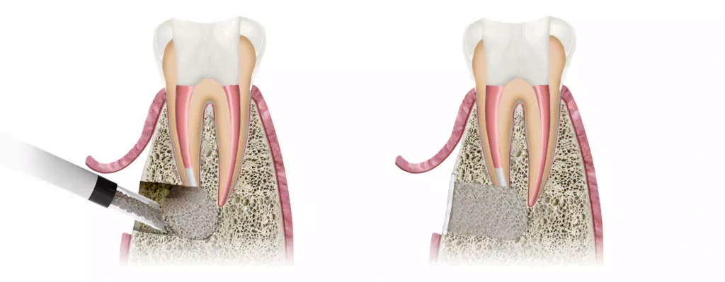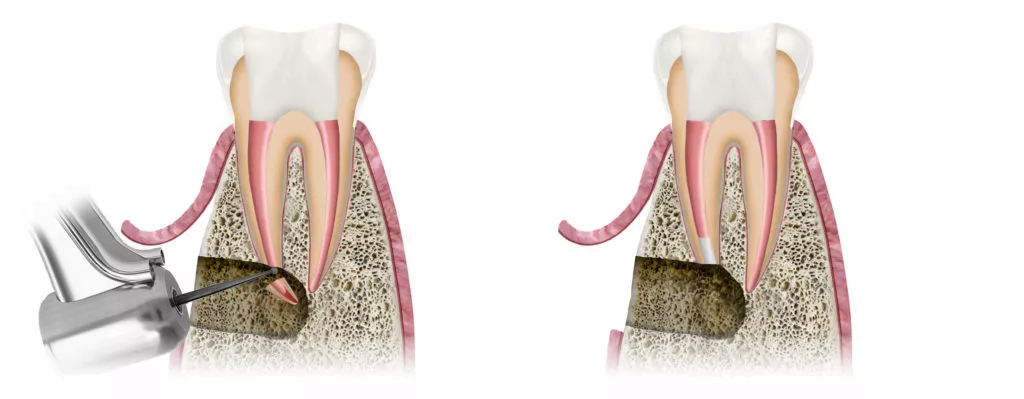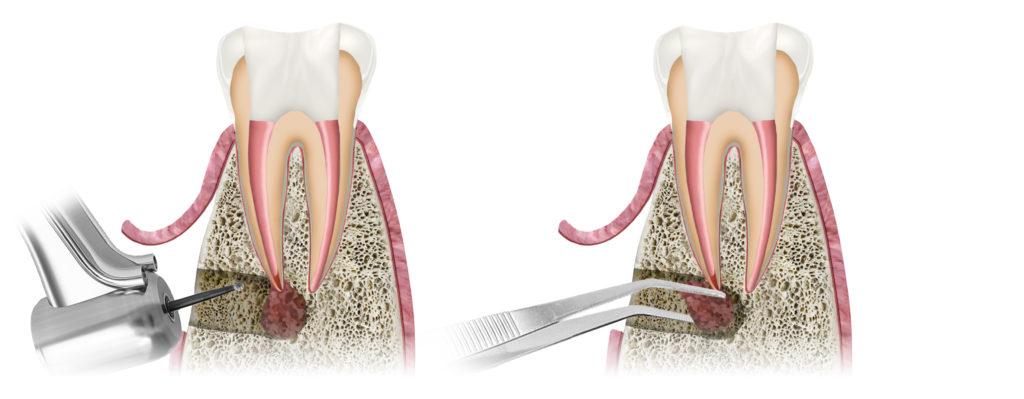This procedure is performed under local anesthesia. The resection entails the removal of the root fragment containing the uncleaned and unfilled portion of the canal. The surgeon, during the process, exposes the bone by opening soft tissues around the root, extracting infected or inflamed tissue, including the root tip. To seal the end of the duct, a specialized cement (MTA) or amalgam is employed. Post-surgery, significant bone loss often occurs, necessitating supplementation with bone substitute biomaterial and protection with a designated membrane.