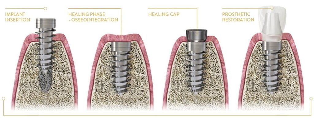 Over subsequent months, osseointegration occurs as the implant post integrates with the jaw bone. Once fully healed, a secondary procedure is performed to attach the abutment if not previously done. Finally, the restorative dentist crafts and places the final crown.